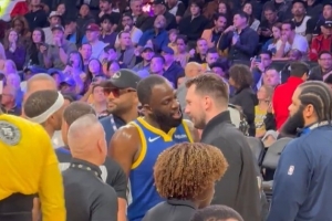 闲不住!追梦场边对东契奇一顿输出 最后两人都笑了GIF-追梦场边狂喷东契奇之后两人全笑了