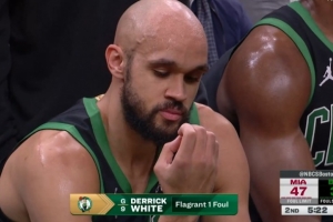 德里克·怀特扑防鲍威尔三分犯规疑似垫脚 裁判回看升级一级恶意GIF-怀特扑防鲍威尔三分犯规,裁判回看升级一级恶意,解说说这是怀特生涯第一个恶意犯规
