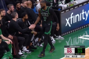 好在无大碍!杰伦·布朗突然一瘸一拐下场休息 很快又回到场上GIF-杰伦·布朗一瘸一拐下场