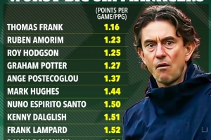 太阳报:弗兰克是英超史上成绩最差的Big6正式主帅,场均仅1.16分体育资讯2月8日讯《太阳报》报道,托马斯·弗兰克是英超历史上成绩最差的Big6球队正式主帅。这位热刺主帅在所有执教英超比赛不少于10场的Big6主教练中,场均积分和胜率均排名垫底。此统计排除了临时/代理