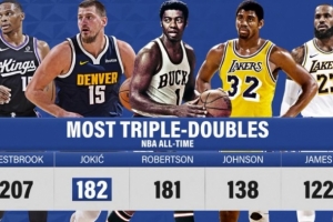 大O:恭喜约基奇三双数超越我 希望你在本赛季剩余比赛中一切顺利体育资讯2月9日讯NBA常规赛,掘金136-120轻取公牛。在本场比赛中,约基奇拿到生涯第182次三双,超越奥斯卡·罗伯特森,上升至NBA历史第二。对此,大O说道:“恭喜这位杰出的球员,尼古拉·约基奇!